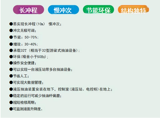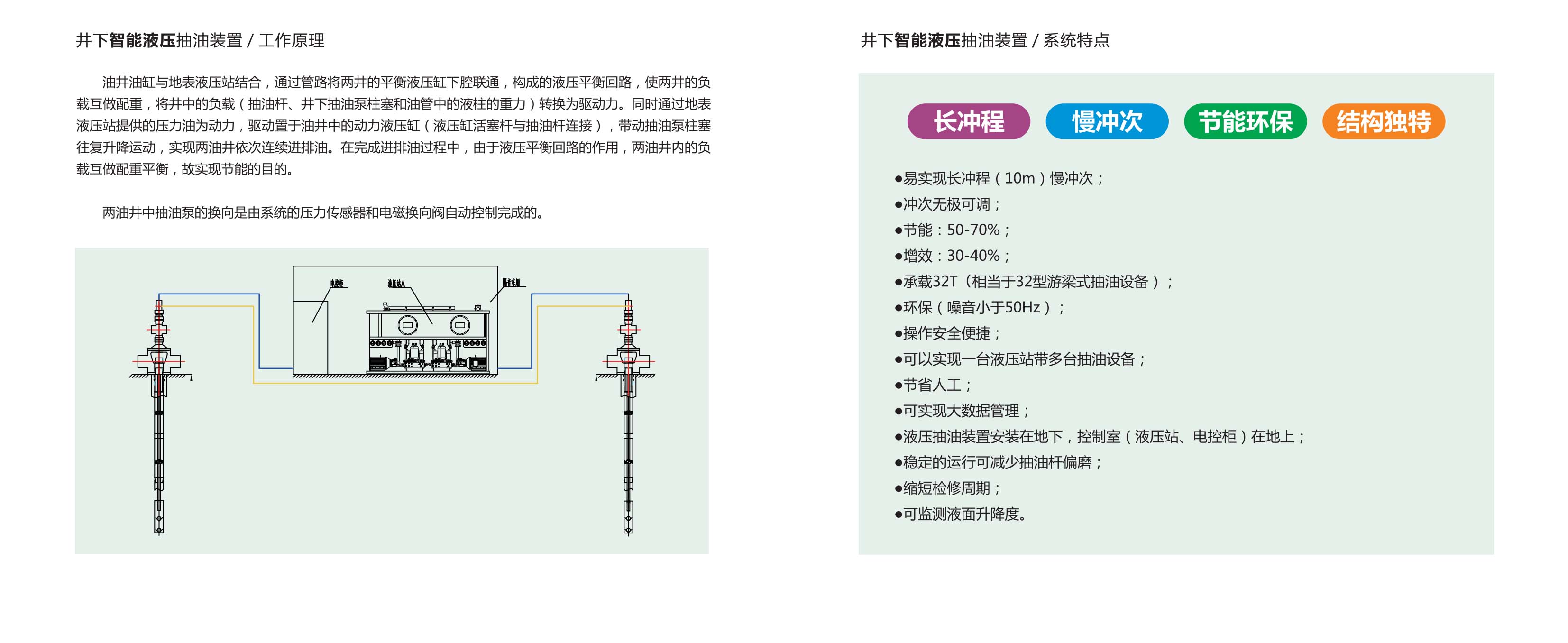 Hydraulic pumping equipment because of its energy saving, high efficiency, controllable has been attracted by the attention of oil fields at home and abroad, especially long-stroke, slow-stroke pumping equipment is more welcome, we through more than ten years of product research and development and research, double well (or multi-well) energy-saving hydraulic pumping equipment, to achieve a stroke of up to 10m hydraulic pumping equipment two new types of downhole hydraulic pumping equipment has been successful.